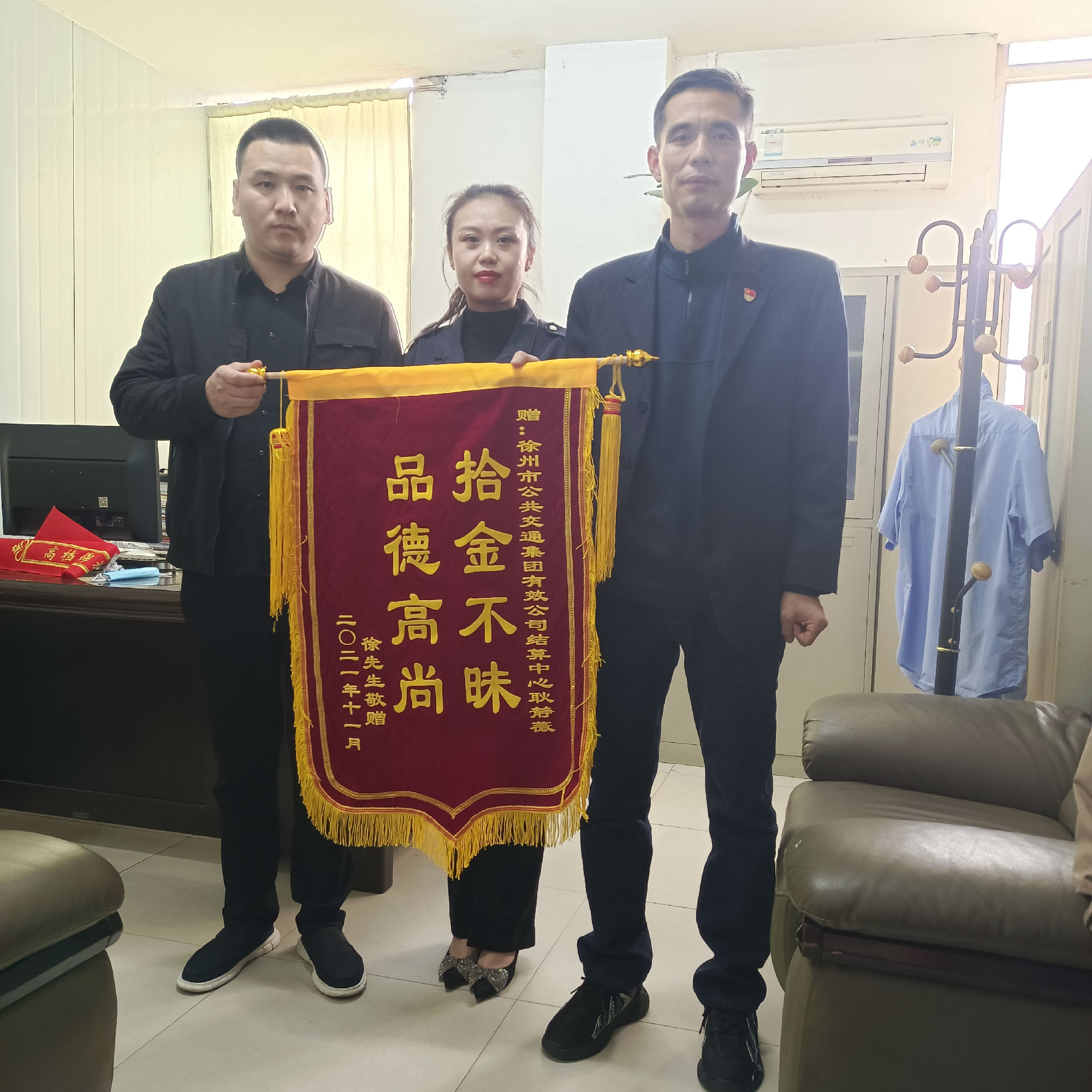 原來11月2日早上,結(jié)算中心職工耿靜薇在上班途中,經(jīng)過夾河街路口時,無意中發(fā)現(xiàn)一個黑色手包,等待許久未見失主前來尋找,便將手包帶到了公司。經(jīng)檢查,包內(nèi)有銀行卡,手機及部分現(xiàn)金,但未找到任何聯(lián)系方式,這時失主的手機鈴聲響起,傳來了失主焦急的聲音。不一會兒,失主徐先生趕到結(jié)算中心,領(lǐng)回了物品。次日,徐先生特意送來錦旗,并表示衷心的感謝!