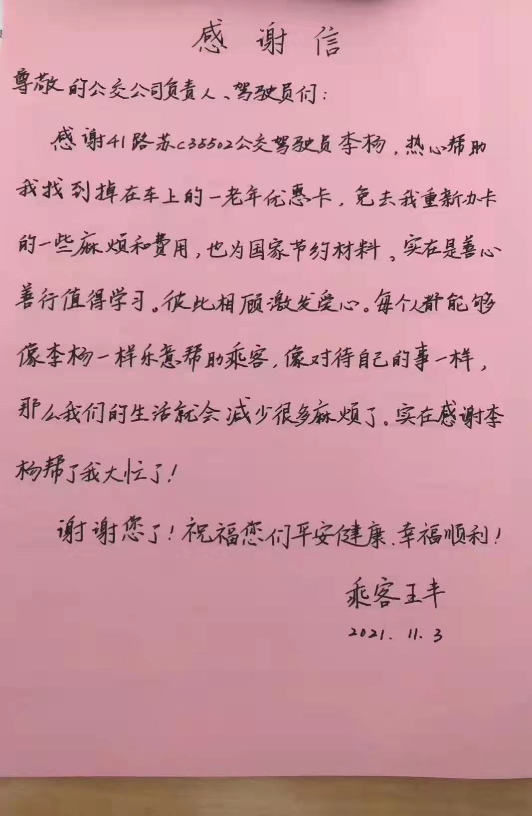 新區(qū)公司駕駛員李楊駕駛41路蘇C35502號車,行駛至銀湖小區(qū)站臺時,乘客王女士向其求助。王女士告訴駕駛員,早晨10點20分左右,她乘坐41路公交車時,不慎將老年優(yōu)惠卡丟在了車上,希望李楊幫她尋找一下。李楊留下了王女士的電話,待車輛到達建筑學(xué)院后,李楊立即去調(diào)度室尋找,根據(jù)王女士提供的乘車時間很快鎖定了車輛,經(jīng)詢問,王女士的老年優(yōu)惠卡已被駕駛員交到了調(diào)度室妥善保管。11月3日下午,王女士取回了失而復(fù)得的老年優(yōu)惠卡,并送來感謝信。