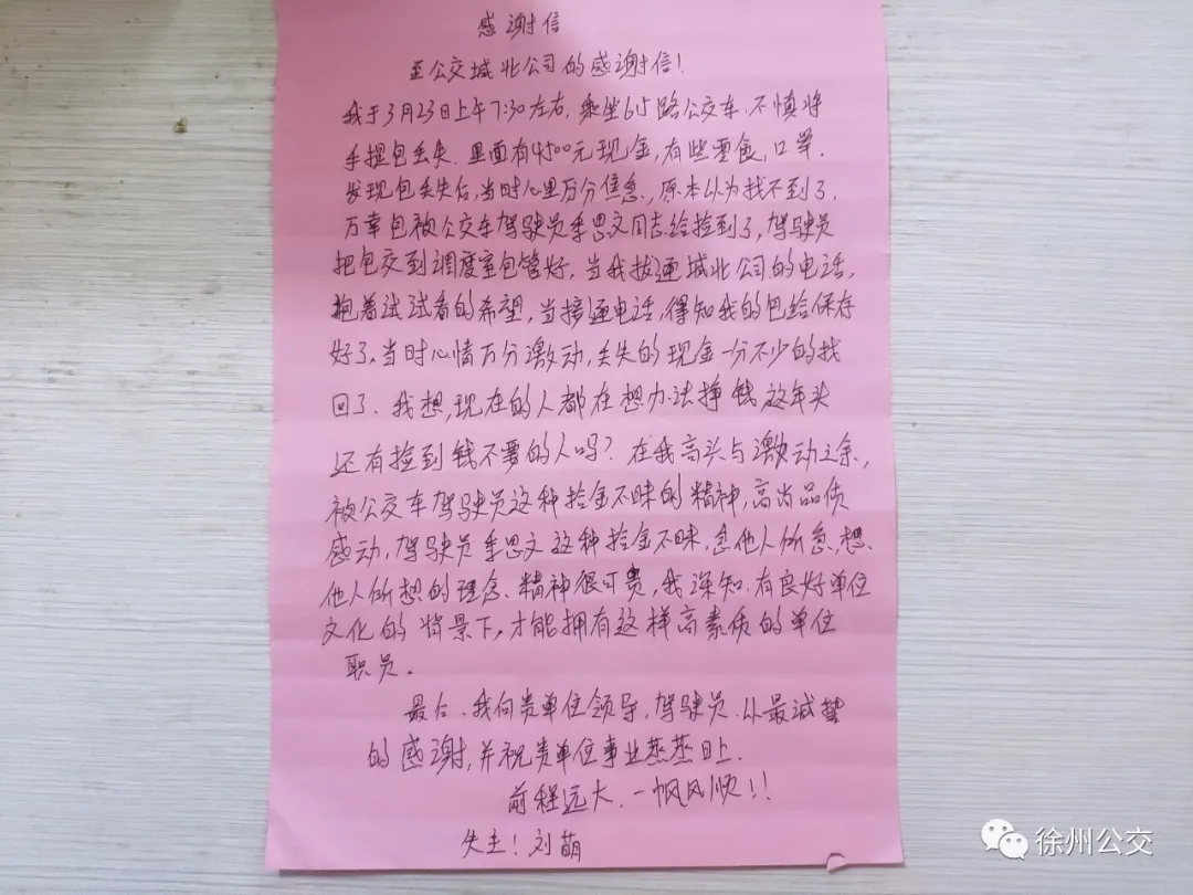 前幾日,市民劉女士在二十四中乘坐615路6952車前往城建家園,上車后,劉女士將隨身攜帶的手提包放在了座位上,下車時有些匆忙,將手提包遺忘在了車上。駕駛員季恩文到食品城公交首末站打掃衛(wèi)生時,發(fā)現(xiàn)了劉女士丟失的手提包。由于已經(jīng)到了發(fā)車時間,季師傅將包收好,到達(dá)劉灣調(diào)度室后交給了工作人員。經(jīng)檢查,包里有4500元現(xiàn)金、駕駛證、身份證等重要物品,此時,發(fā)現(xiàn)手提包丟失了的劉女士也撥打了服務(wù)熱線,得知她的物品已被妥善保管后,劉女士十分激動。當(dāng)天下午,劉女士拿回失物并特意寫了一封感謝信表達(dá)對季師傅的感激之情。