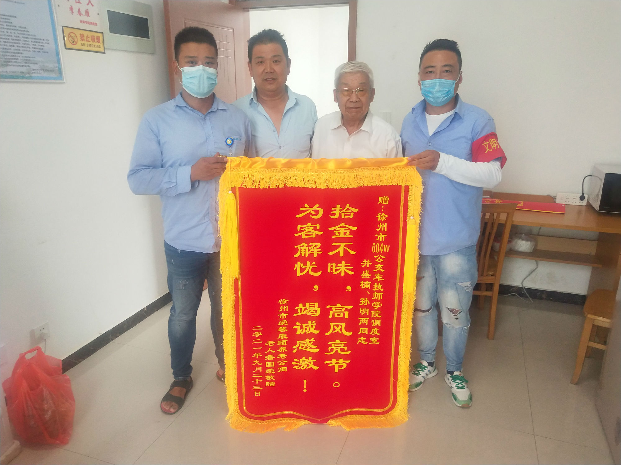 近日,一位老先生在家人的攙扶下,來到了城北公司604路技師學院調度室,將一面印有“拾金不昧,高風亮節(jié),為客解憂,竭誠感謝”字樣的錦旗送到604路駕駛員孫明和調度員盛楠手中。