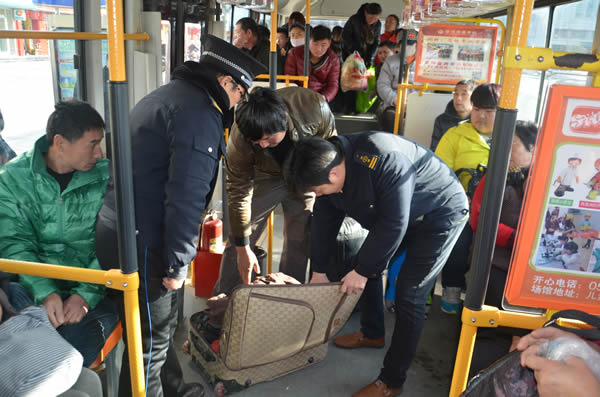12月2日,在第三個(gè)全國(guó)交通安全日來(lái)臨之際,公交服務(wù)督導(dǎo)隊(duì)聯(lián)合公安公交管理大隊(duì)開展了危險(xiǎn)品大檢查。檢查組分為5個(gè)小隊(duì),分別在火車站廣場(chǎng)、副廣場(chǎng),東甸子公交站臺(tái),對(duì)公交車乘客攜帶物品進(jìn)行仔細(xì)檢查,確保公交乘客安全。